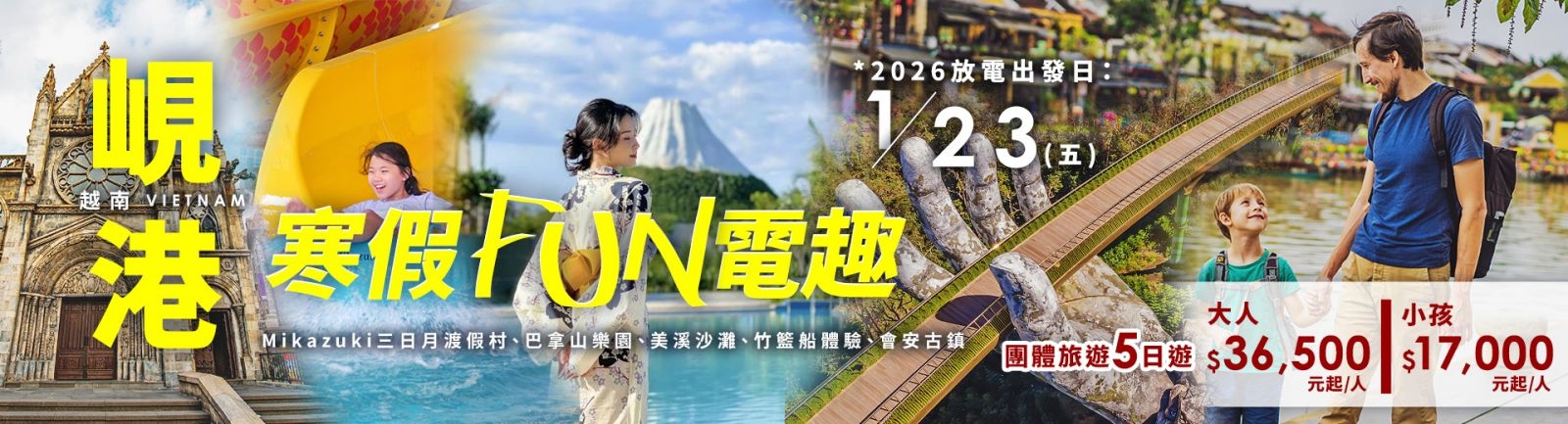 親子子網首頁 > 精選行程 > 越南親子 > #峴港。寒假FUN電趣~Mikazuki三日月渡假村、巴拿山城、會安古鎮 【團體旅遊五日】
